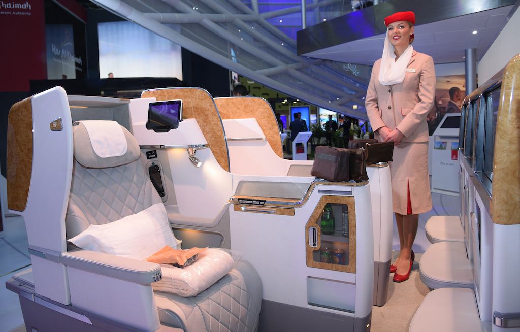 - Emirates First Class suite with privacy doors Unique to a hand full of airlines and is commonly considered the most luxurious way to fly with any commercial airline. With 4 staff to cater to only 14 seats you can expect to be waited upon hand and foot.